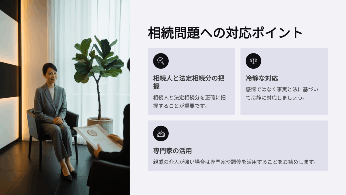 弁護士や行政書士に「直接話してもらう」のではなく、「一緒に同席してもらう」だけでも、親戚側のトーンが変わることが多いんです。第三者がいることで、相手も言動に慎重になりますし、自分も冷静でいられる支えになります。