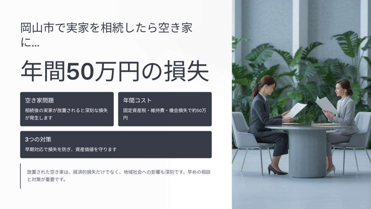 この記事では、空き家を放置すると「年間50万円損する」と言われる理由を、税金・維持管理・岡山エリア特有の事情から分かりやすく解説します。そして、今日からできる3つの対策を、専門家として丁寧にお伝えします。