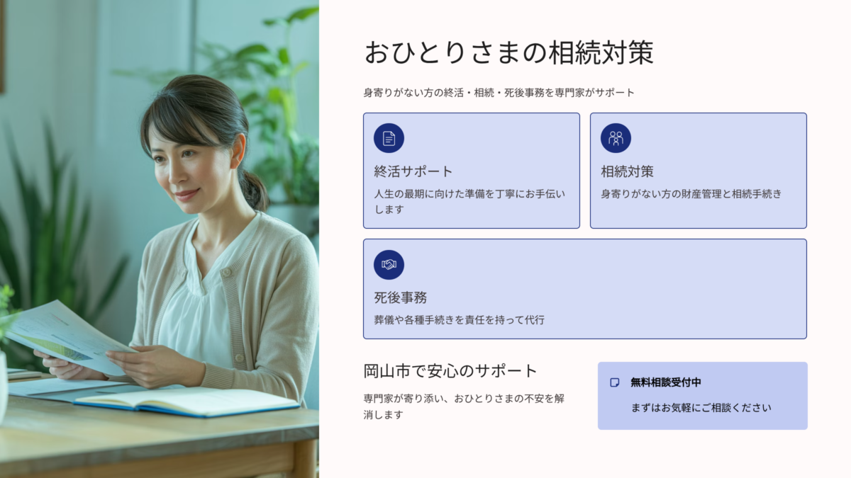 相続診断士として岡山市で多くのおひとりさまの相談に向き合ってきて、私が確信していることがあります。