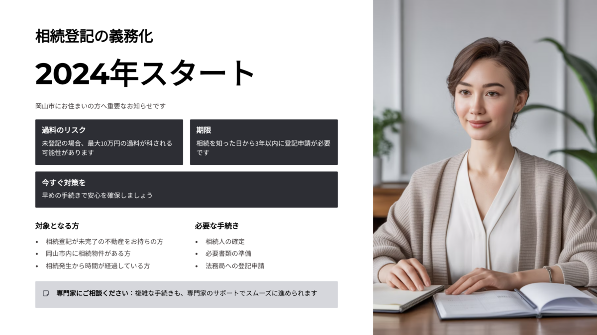岡山市で相続相談をしていると、ここ1年で本当に多く聞くようになった不安です。実は2024年から、相続登記は“義務”になりました。私自身も32歳のときに実父の相続を経験し、「名義変更は後でいい」と先送りしてしまった一人です。その結果、家族で余計な話し合いが必要になり、母に不安な思いをさせてしまいました。