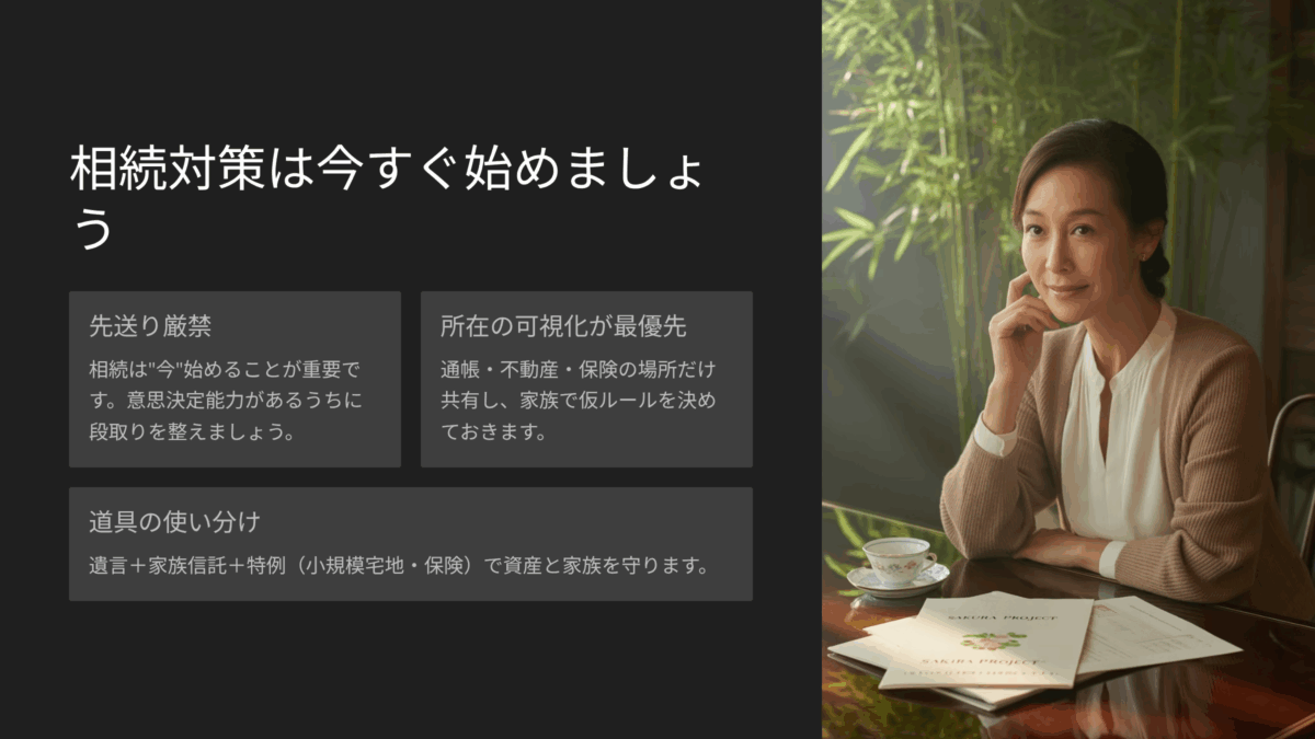 - 「合意の土台」=遺言・所在メモ・議決ルール。これがないと、感情が実務を飲み込む。
