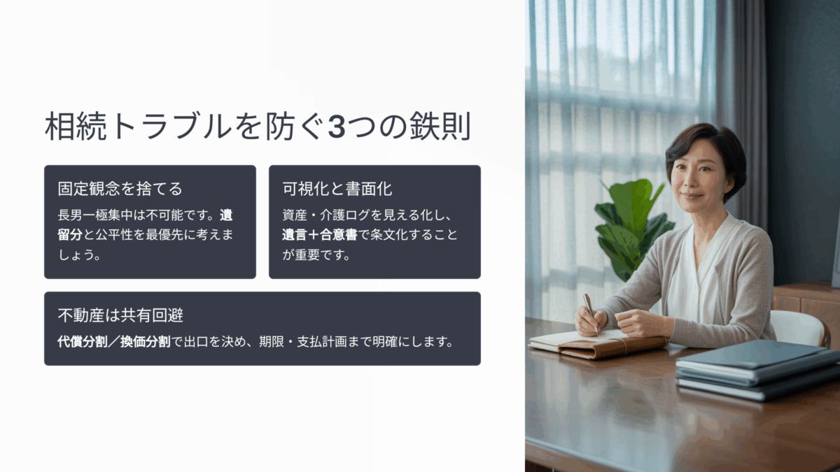 「長男が継ぐべき」――その思い込みが相続・不動産・介護を壊します。遺言・代償分割・家族信託で争族を防ぐ実践手順を解説。目次を見て必要なところから読んでみてください。
