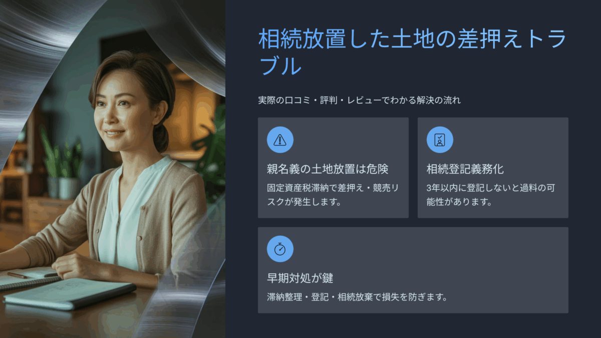 この記事では、親名義のまま10年放置された土地が差押えに至る仕組みから、解除・再発防止のための具体的なステップまでわかりやすく解説します。