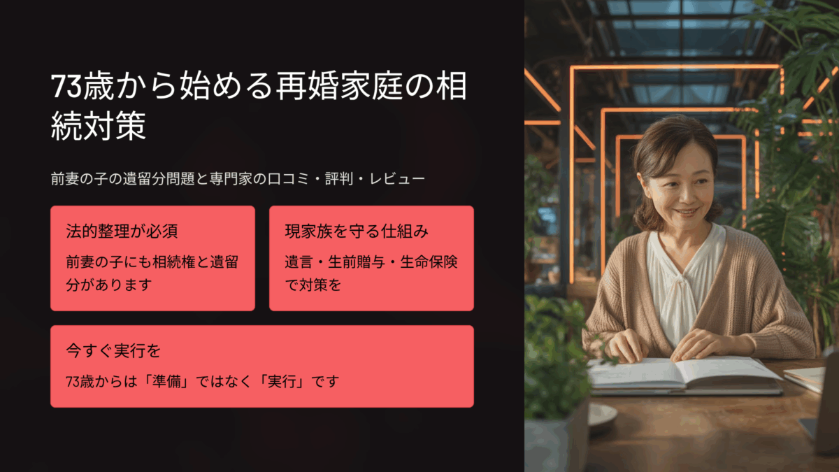 再婚家庭では、前妻の子どもにも法定相続権があるという点が最も重要です。73歳という年齢になると、そろそろ「自分の財産をどう残すか」を考える時期ですが、再婚家庭の場合、単純な「夫婦+子ども」では整理できない複雑な相続構造が生まれます。