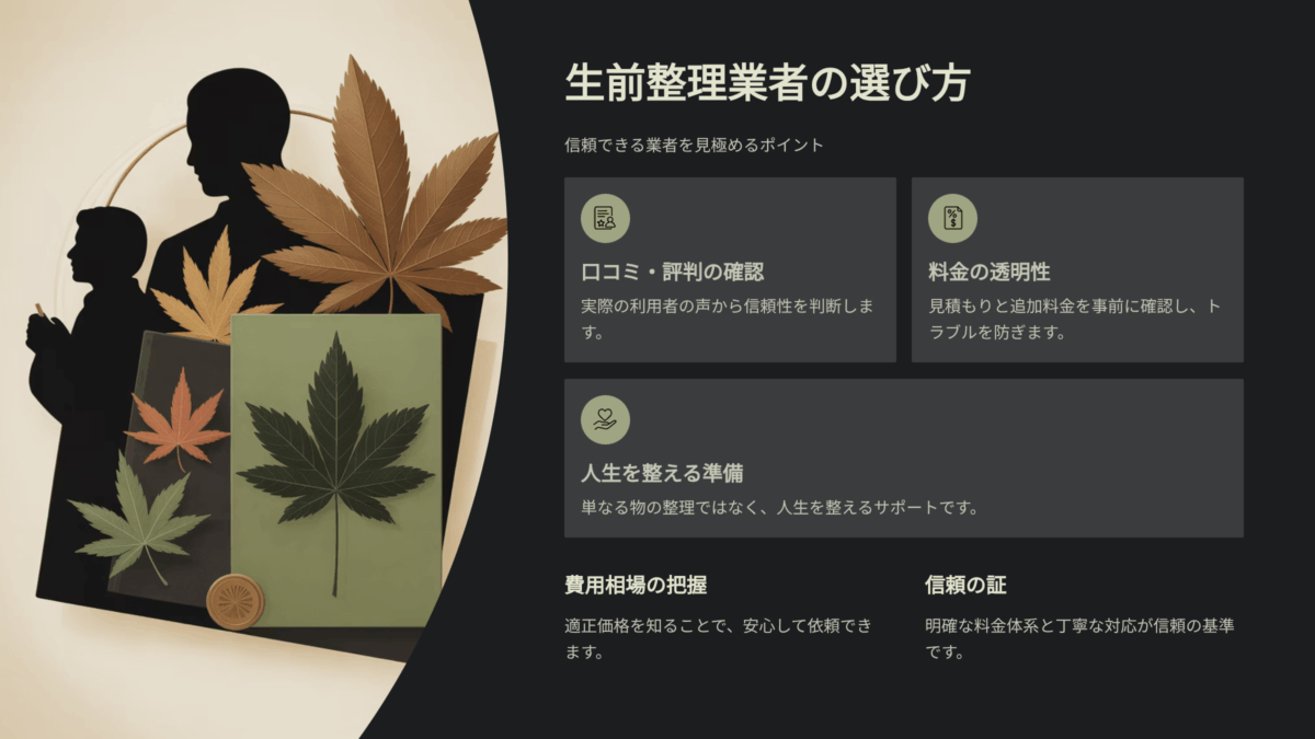 「生前整理を頼みたいけれど、どんな業者を選べばいいの?」