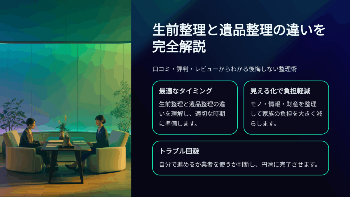 - 「生前整理」と「遺品整理」、まずはここから違いを押さえる