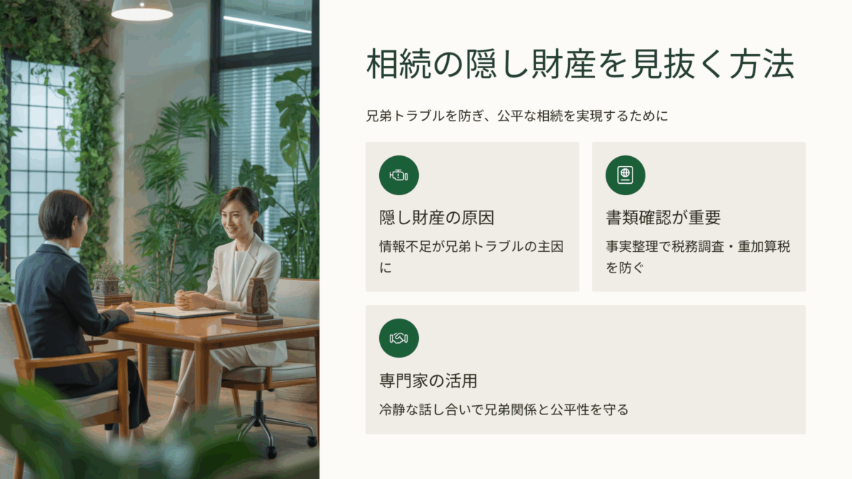 隠し財産の実態、調査手順、兄弟間での交渉の進め方、法務・税務のリスク、そして未来のトラブルを防ぐための準備まで、ストーリー形式でやさしく整理しています。